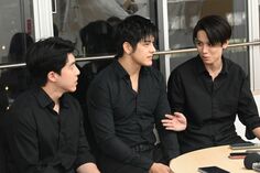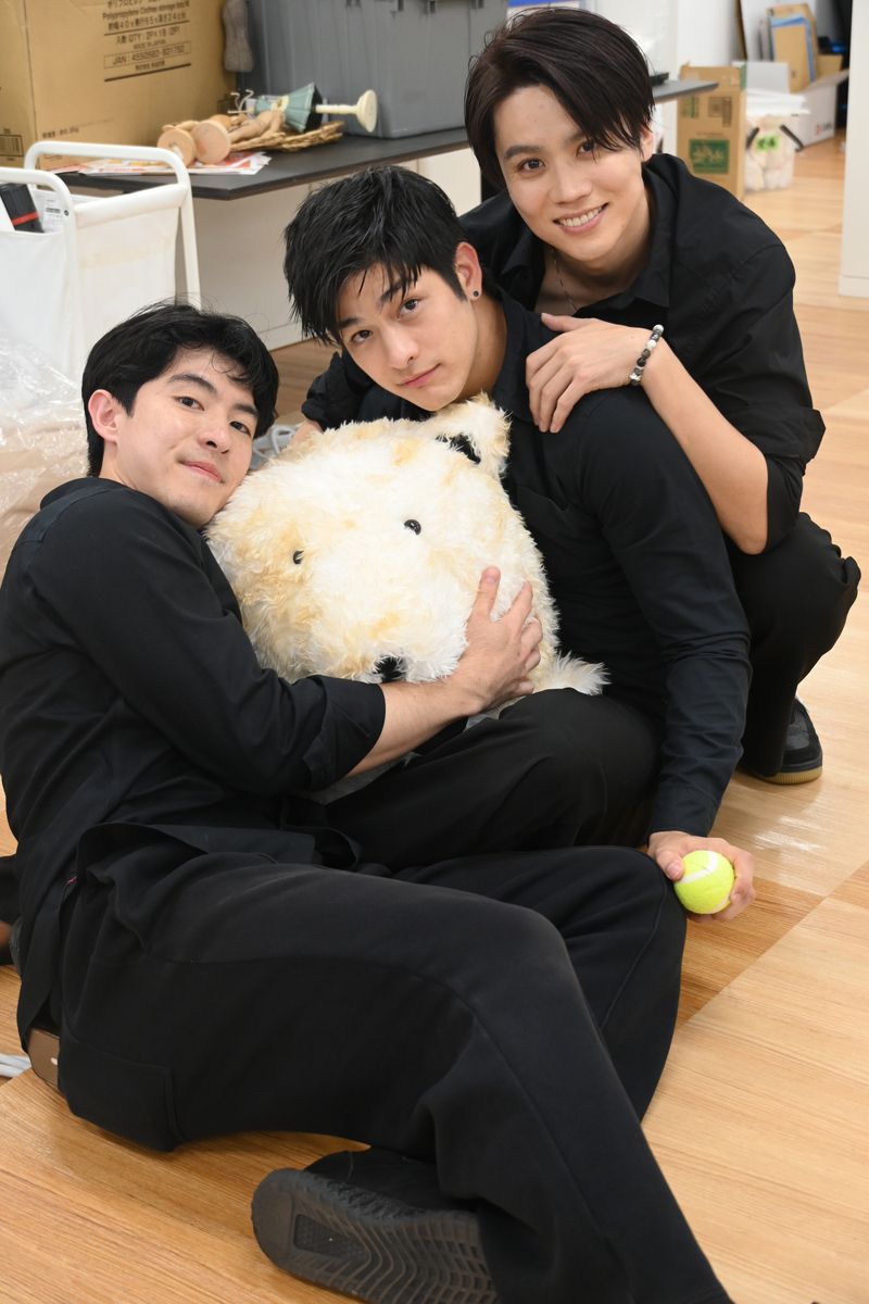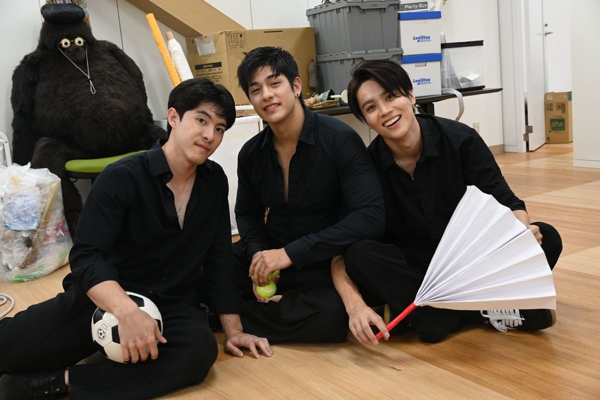 ドラマに登場する小道具を使ってポーズを取るNipponBoyzの3人