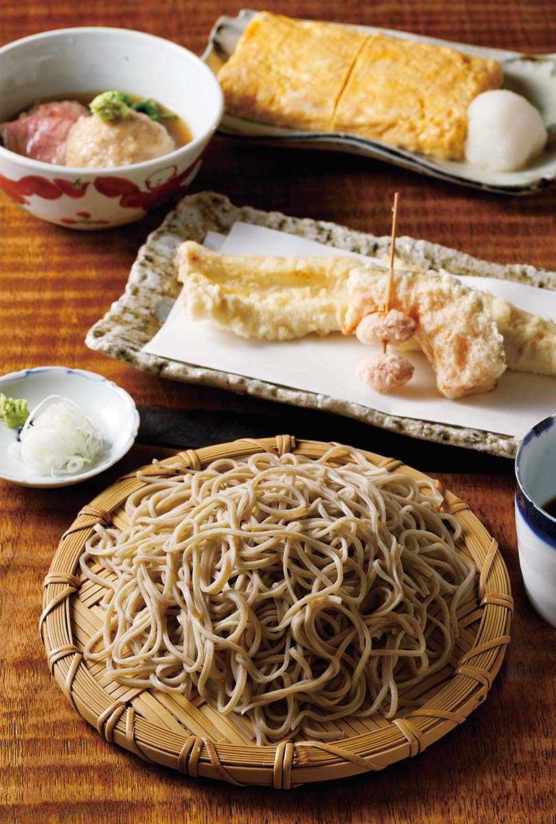 手前から、福井県の在来種を打った「せいろ」1100円。裂きたての、ふわっとした食感が魅力の「穴子の天ぷら」1900円。「鴨とそばがきの治部煮」2200円。山形産の鴨とそばがきは別々に調理し、最後に合わせて仕上げた一品。ほのかに甘い「玉子焼き」1500円