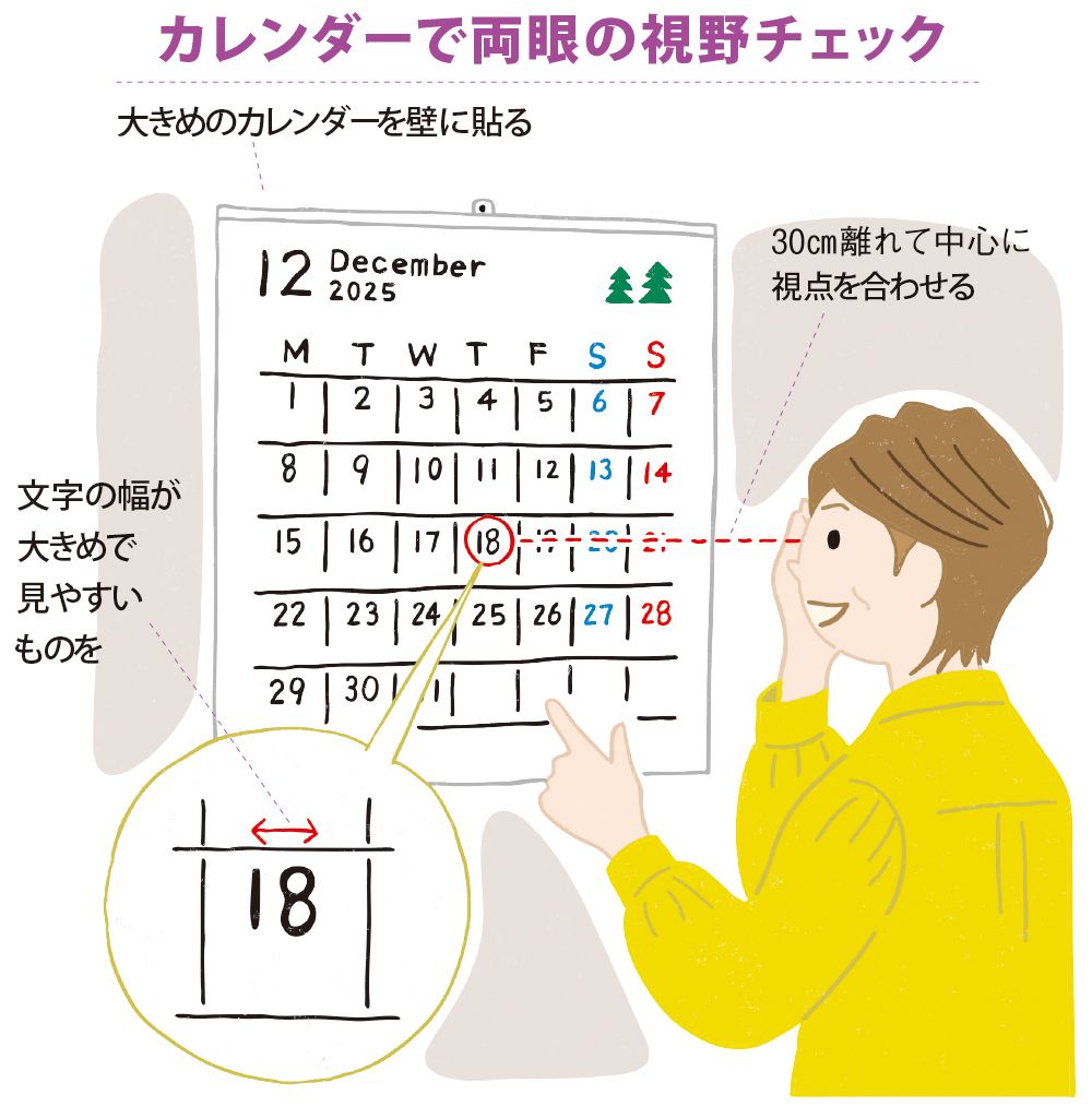 〈カレンダーで両目の視野チェック〉片目を隠し、視点をカレンダーの中心からずらさずに1~30の数字を順番に見る。 反対の目も同様に。数字が見えない箇所がある場合は視野欠損の可能性あり