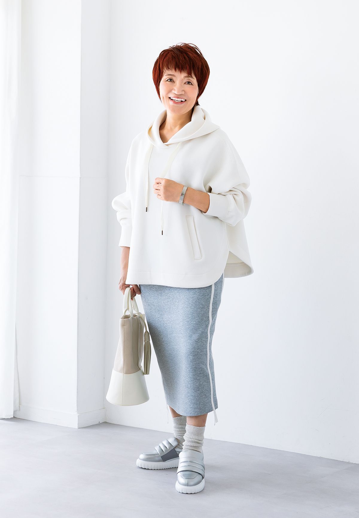グレースカート¥15,400/DUE deux フーディー¥33,000/MOGA バングル¥8,640/アビステ バッグ¥7,590/カシュカシュ(アンビリオン) ソックス¥1,320/靴下屋(タビオ)スニーカー¥31,900/ヒルズアヴェニュー(プライア)