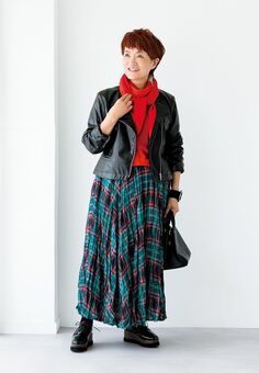 チェックスカート¥14,300/DUE deux ブルゾン¥49,500/タバサ(パパス) ニット¥30,800/MOGA ストール¥14,300/ニーシャ・クロスランド(ムーンバット) バングル¥4,320/アビステ バッグ¥7,590/カシュカシュ(アンビリオン) ソックス¥1,320/靴下屋(タビオ) 靴¥34,100/ヒルズアヴェニュー(プライア)