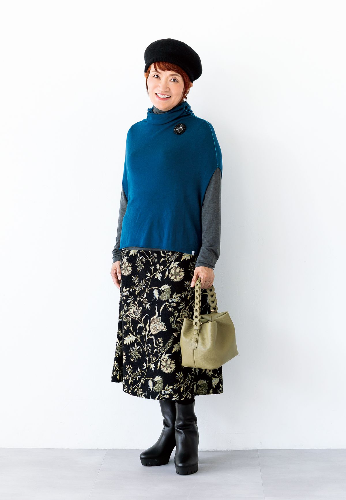 ゴブラン織りスカート¥47,300/タバサ(パパス) ブルーニット¥31,900/アンティパスト(クープ・ドゥ・シャンピニオン) ハイネック¥7,150/ステートオブマインド(ゲストリスト) 帽子¥2,860/エスタ(ムーンバット) イヤリング¥11,000、ブローチ¥10,800/ともにアビステ バッグ¥6,930/カシュカシュ(アンビリオン) ソックス¥1,320/靴下屋(タビオ) ブーツ¥25,960/ランバン オン ブルー(モーダ・クレア)