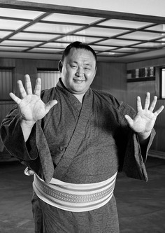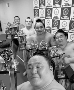 今年の七月場所千秋楽で、三賞を受賞した力士たちと一緒に自撮り。玉鷲関(手前)以外は全員20代(写真提供:玉鷲関)