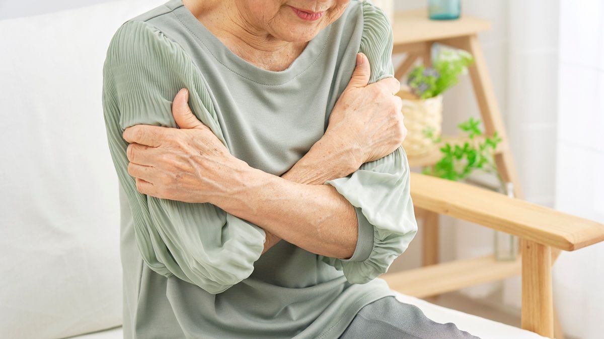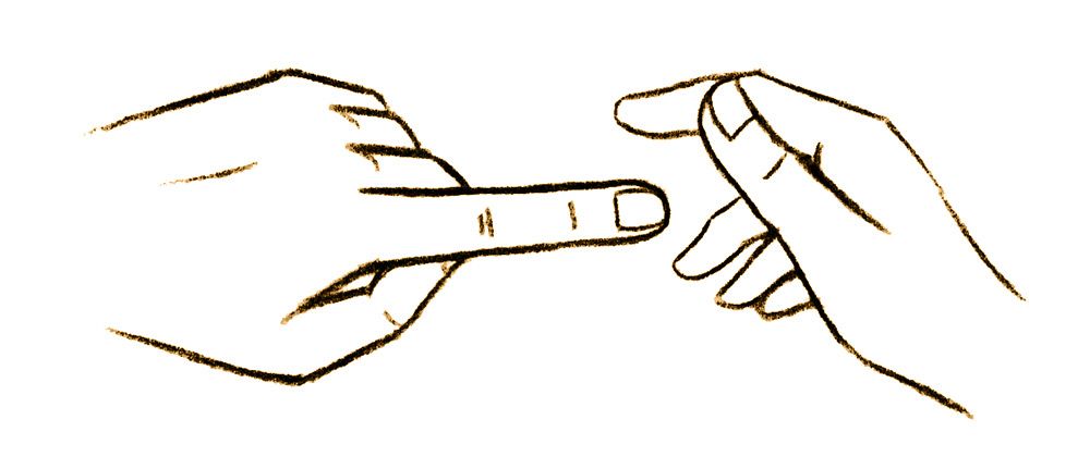 チェック!指つまみテスト 1)人差し指の爪を、もう片方の手で5秒間ギュッとつまむ。