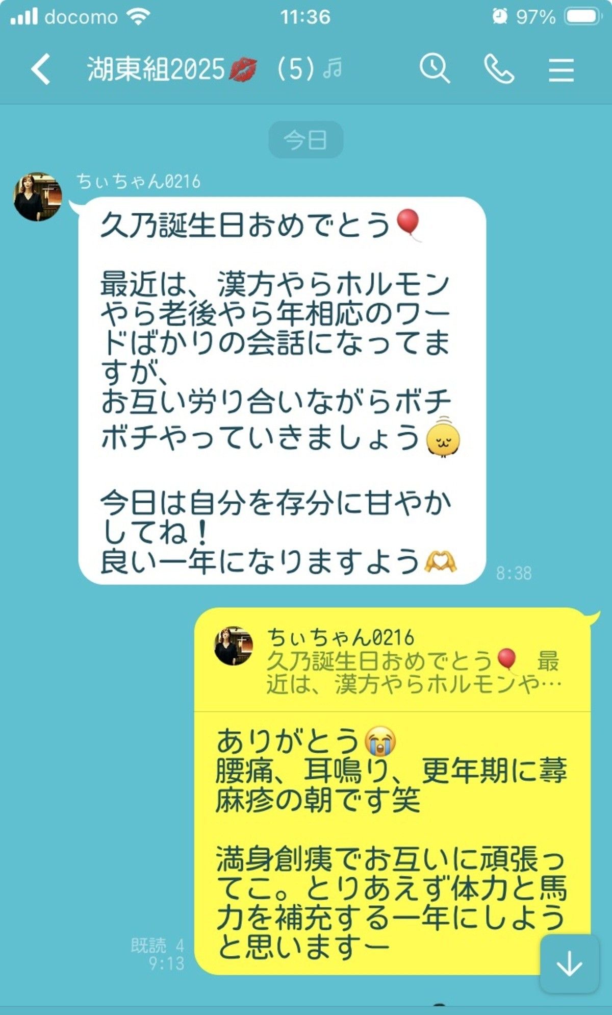 誕生日に送り合うグループLINEの一部。送信は朝8時38分とおばさんらしく