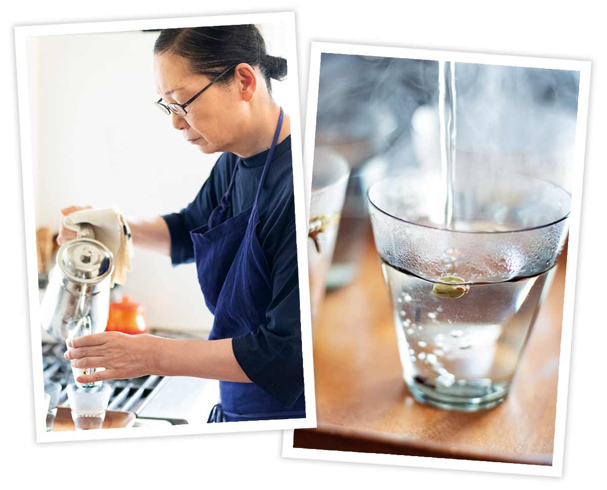 寒くなってくるとお白湯にもスパイス類を加えるという長尾さん。カルダモン2粒(ハサミで切り込みを入れる)、シナモンスティック適量、クローブ1粒をカップに入れ、熱湯を注ぐ。「体が温まり、スパイスの香りで癒やされます」