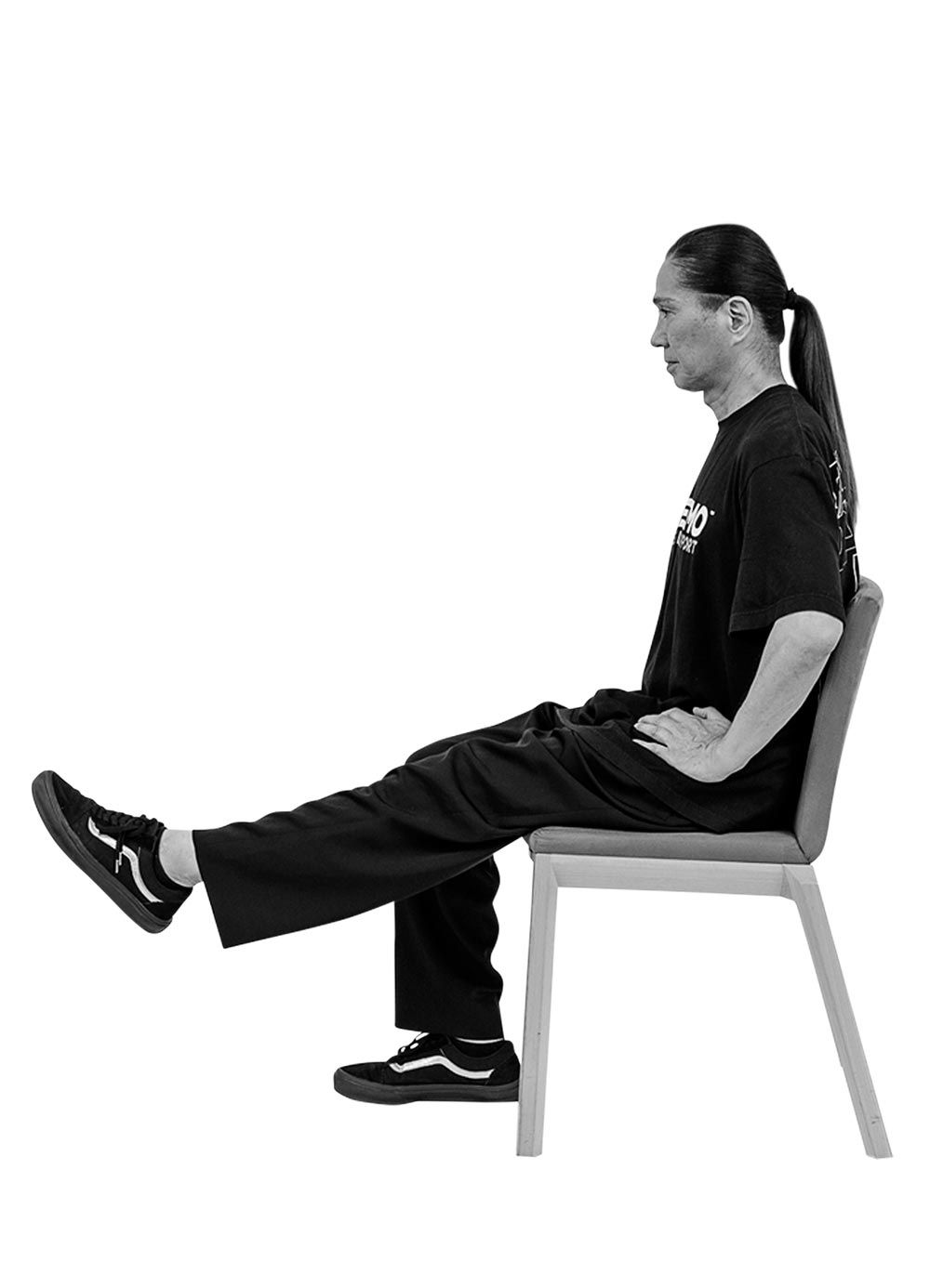 背もたれに背をつけて座る。股関節から足を上げることを意識して、片足ずつ前に蹴りだす