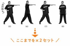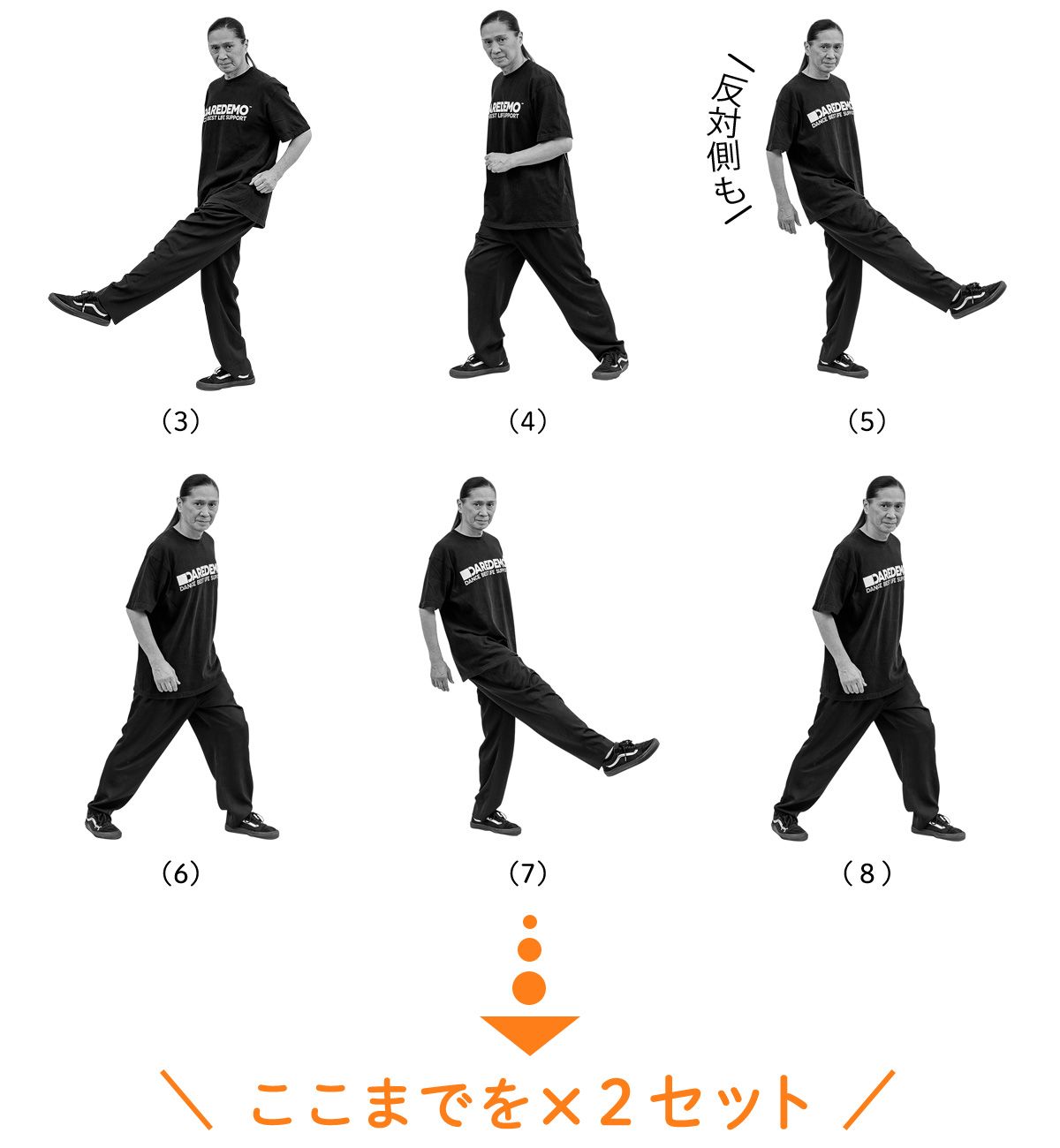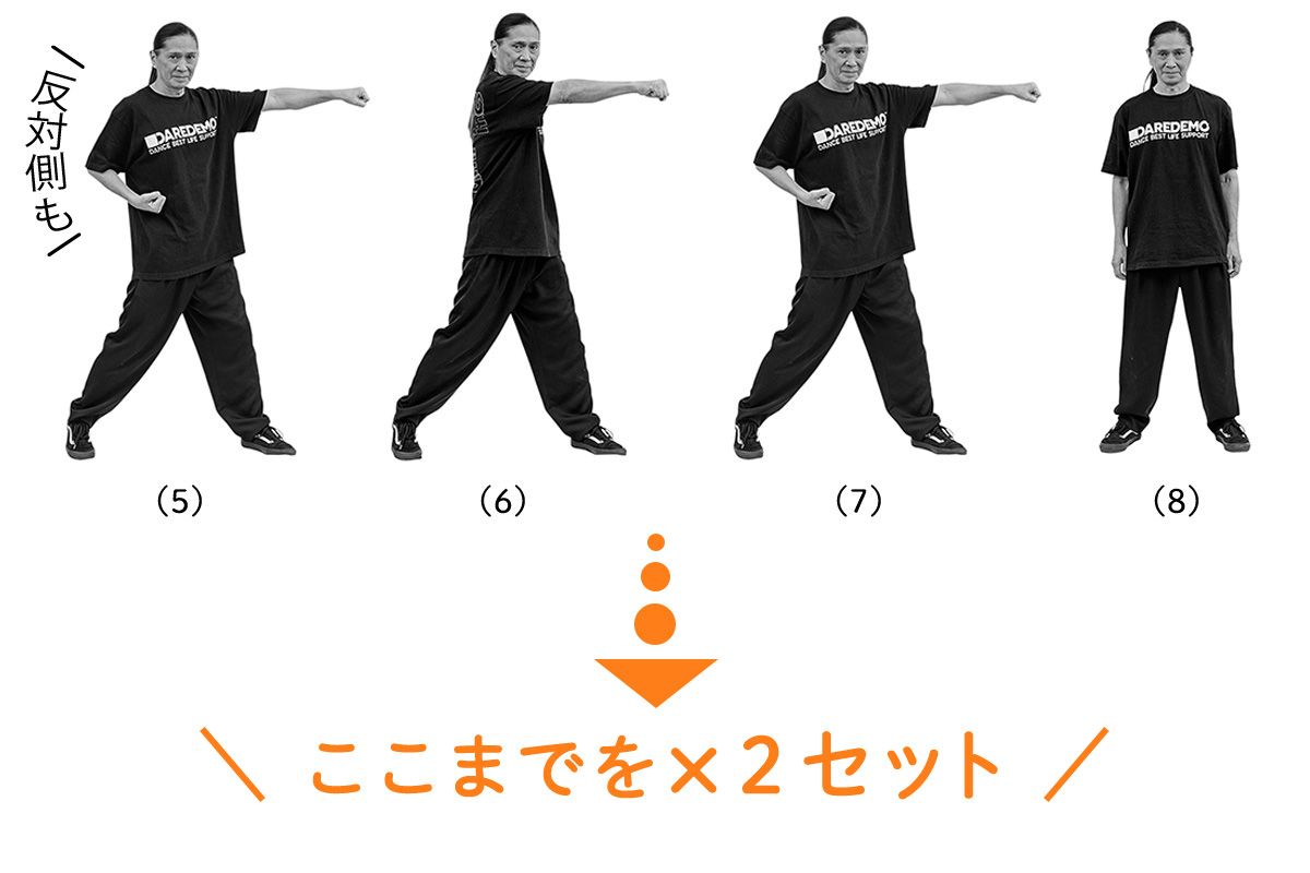 (2)(1)の姿勢から、右足を後ろに引く。(3)(4)も同様に