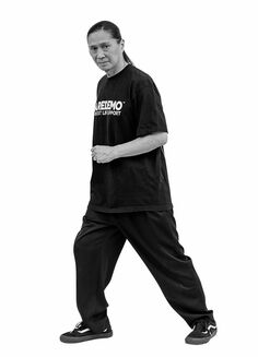 (2)同じ姿勢のまま、右腕を後ろに引いて、左腕でパンチ
