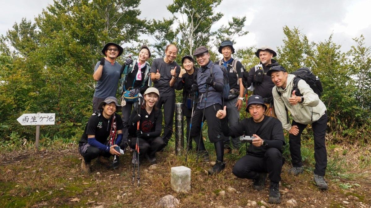 ようやくたどり着いた頂上で記念撮影。重い機材を担ぎながら後ろ向きで山を登るスタッフさんたちの姿に感動しました。山の楽しさを教えてくれた類さんと皆様に、心から感謝を込めて。