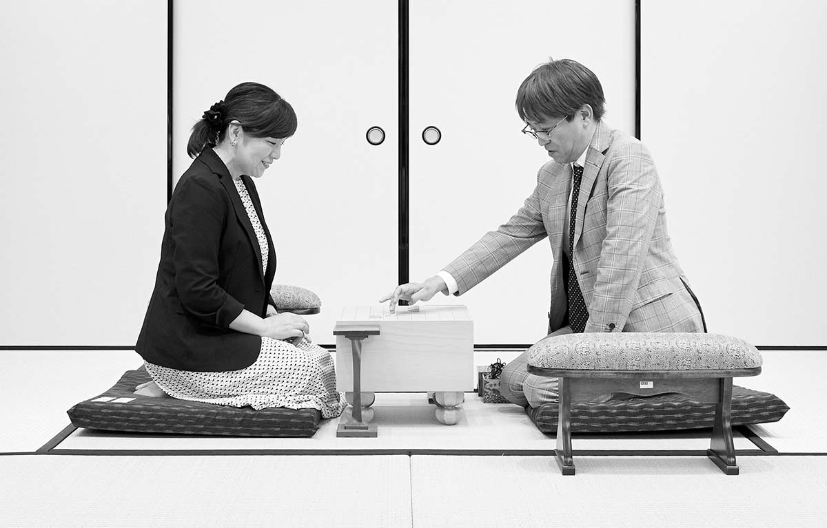 記事本文へ戻る 「若いときに切り替えが難しいのは、記憶力がいいからなんですよ」(羽生さん) 作家・柚月裕子さん(左)と、棋士の羽生善治九段(右)/将棋会館内の「棋の音」にある「こもれびの間」にて(撮影:大河内禎)