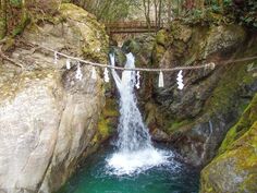 東の滝。神社で購入した龍玉に息を吹き込み、願いを込めて滝に投げ入れよう