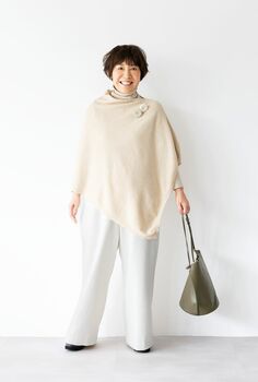 ニットポンチョ¥27,500/セラッチ ジャポン タートルニット 参考商品/DUE deux パンツ¥74,800/アンティパスト(クープ・ドゥ・シャンピニオン) ブローチ各¥3,960/ともにdesignsix バッグ¥6,490/カシュカシュ(アンビリオン) ブーツ¥39,600/ヒルズアヴェニュー(プライア)
