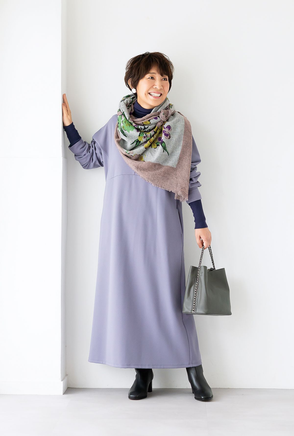 パープルワンピース¥19,250/セモア タートルニット、ストール 参考商品/ともにDUEdeux イヤリング¥3,160/アビステ バッグ¥7,590/カシュカシュ(アンビリオン) ブーツ¥36,960/ランバン オン ブルー(モーダ・クレア)