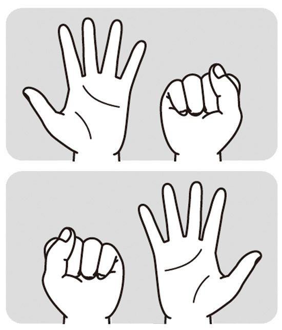 2)「グー」と「パー」を交互に出す体操を20回行う(右手がグーのとき、左手はパー)