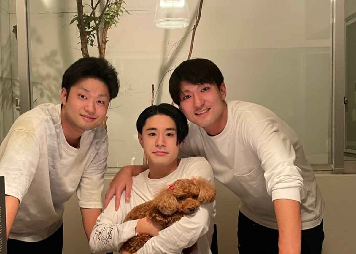 三兄弟仲良く、愛犬めんまと一緒に。左から二男の福之助さん、三男の歌之助さん、橋之助さん