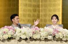 婚約会見でお相手の能條愛未さん(右)を紹介する橋之助さん(撮影:荒木大甫)