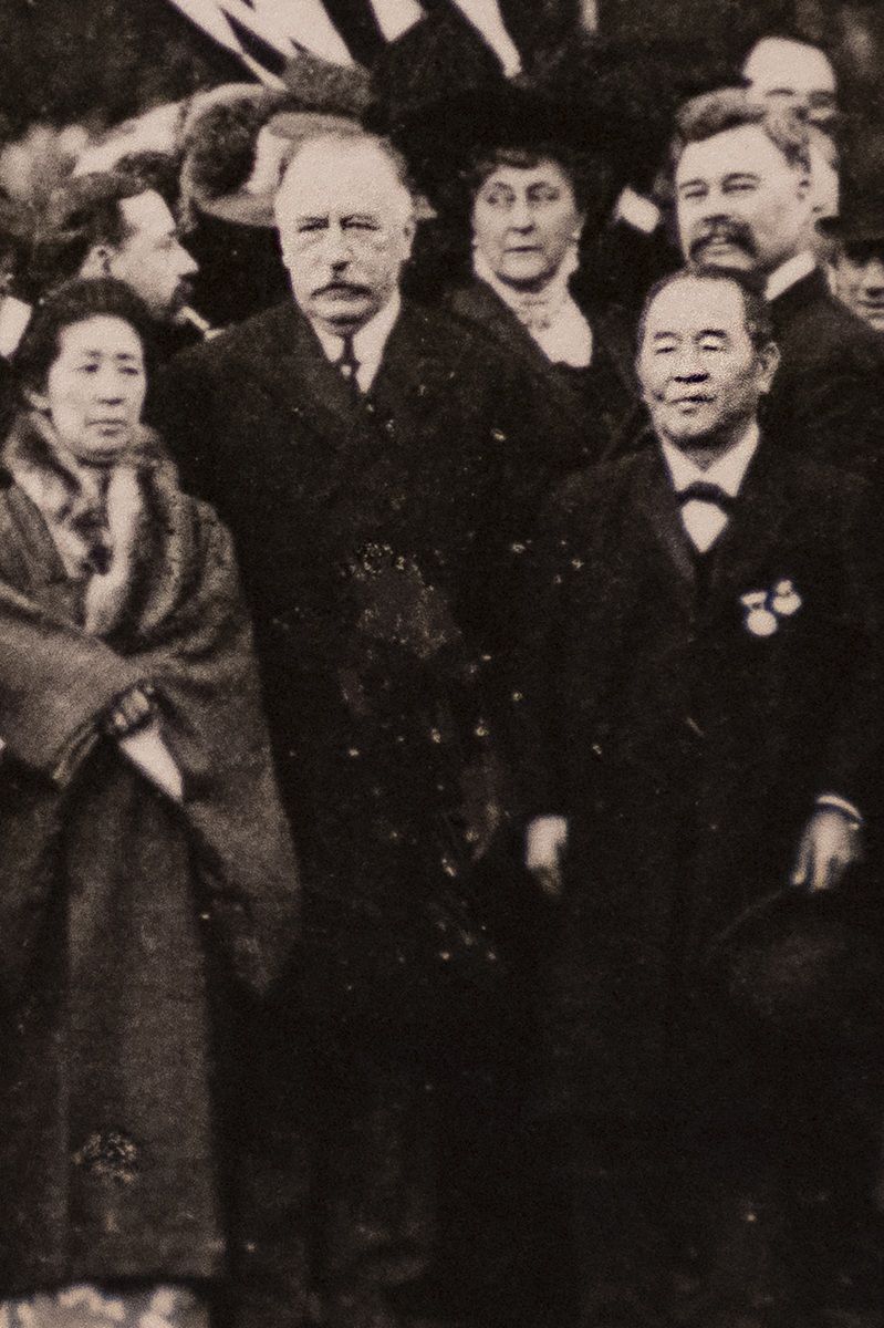 ブイ氏がサンマテオの屋敷の前で訪米団を迎えた 時の写真。向かって右隣は渋沢栄一(著者提供)