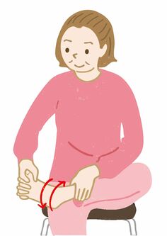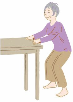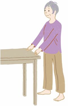 1)テーブルなど丈夫なものにつかまり、両足を肩幅に開く。つま先は正面に向ける
