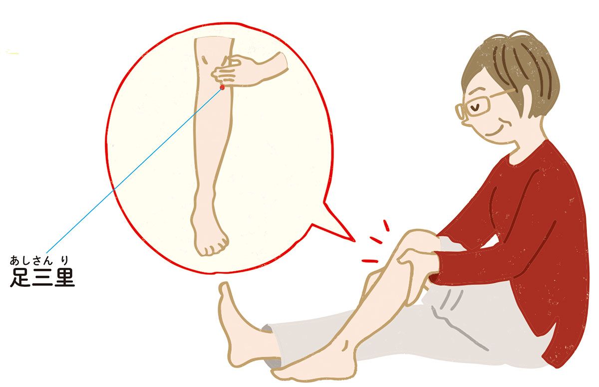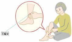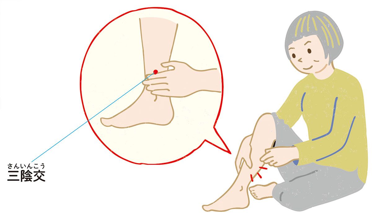 内側のくるぶしのてっぺんから指4本分、上がったところ。骨の際にあるくぼみの部分