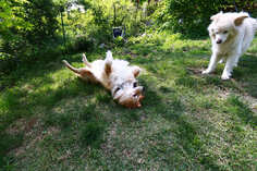 芝生ゴロゴロの福助を見守る大吉(写真提供:草思社)