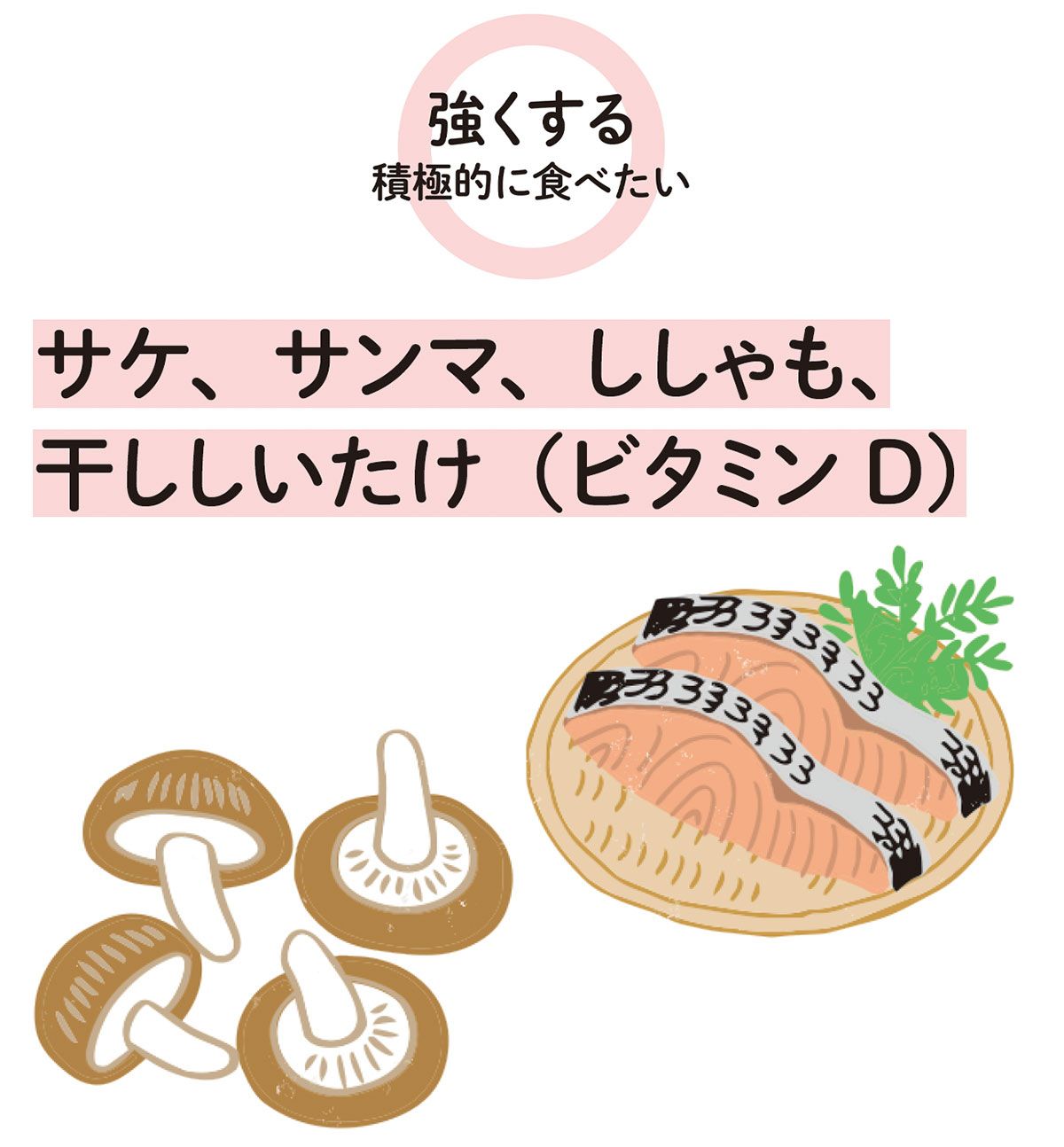 魚やきのこ類、天日干しのしいたけ、きくらげはビタミンDの含有量が高い
