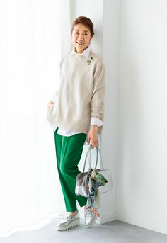 グリーンパンツ¥16,280、ニット¥11,000、シャツ¥8,800、ピンブローチ(大)¥5,500、(小)各¥3,300/すべてDUE deux イヤリング¥15,400/アビステ バッグ¥14,960/ペルケ(アンビリオン) バッグにつけたスカーフ¥14,300/ニーシャ・クロスランド(ムーンバット) ローファー¥29,700/ヒルズアヴェニュー(プライア)