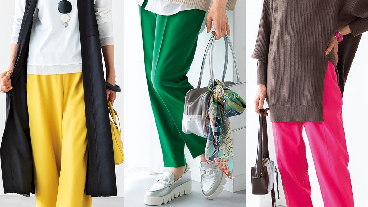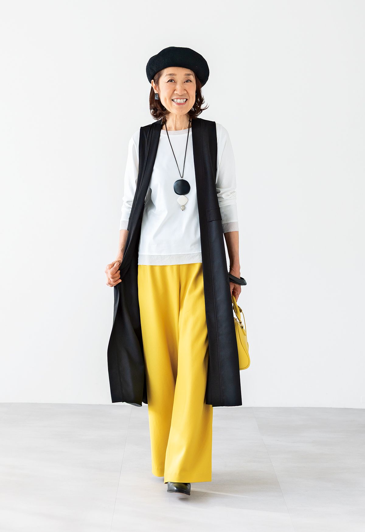 イエローパンツ¥6,589/ドゥクラッセ ジレ¥13,200/セモア カットソー¥14,300/DUE deux 帽子¥2,090/アトレナ イヤリング¥7,920、バングル¥13,200/ともにアビステ ネ ックレス¥13,200(3月発売)/タバサ(パパス) バッグ¥6,930/カシュカシュ(アンビリオ ン) ブーツ¥36,960/ランバン オン ブルー(モーダ・クレア)