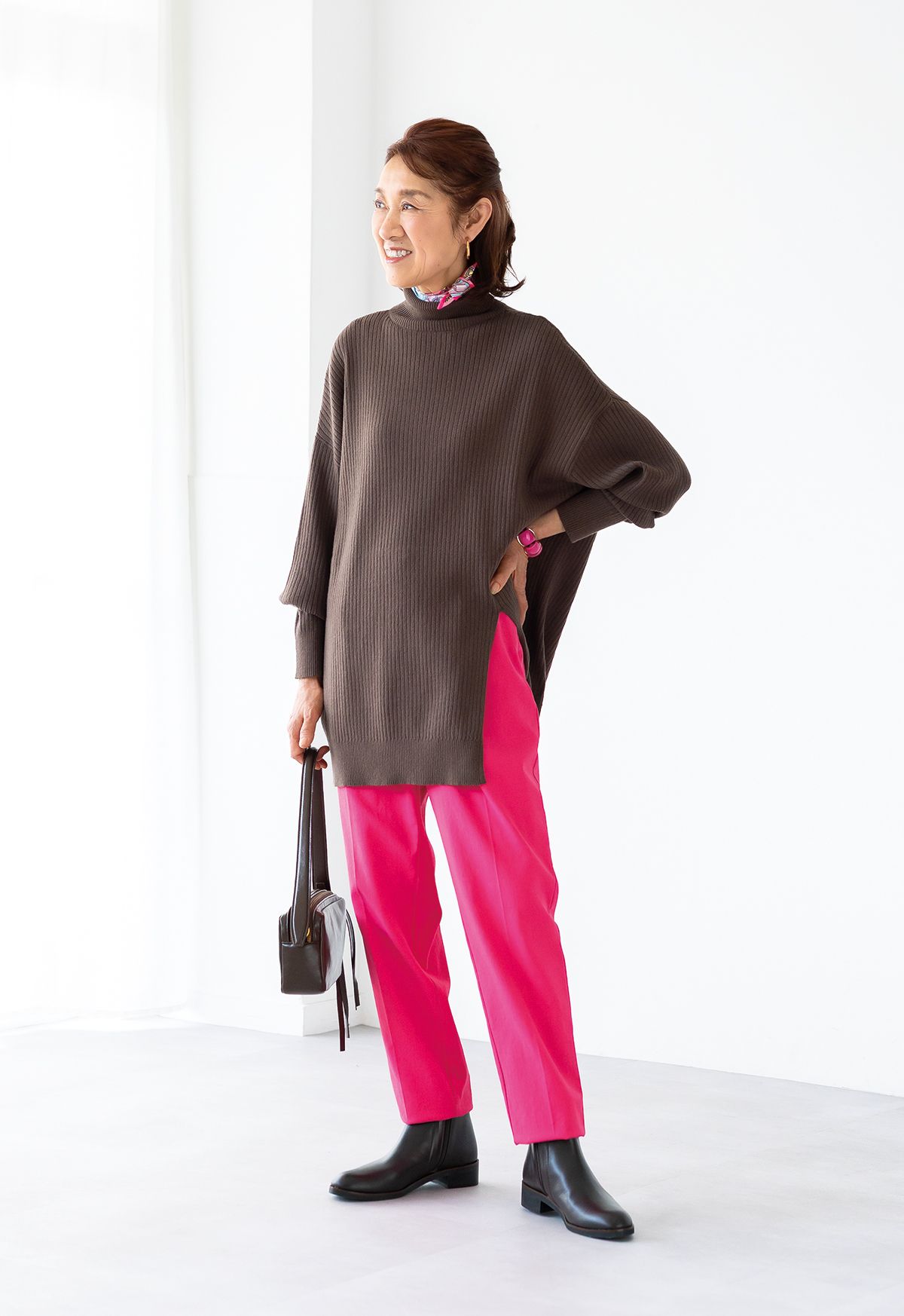 ピンクパンツ¥17,490/ドゥクラッセ ニット¥11,000、スカーフ¥3,300/ともにDUE deux イ ヤリング¥17,600、バングル¥8,800/ともにアビステ バッグ¥7,590/カシュカシュ(アンビ リオン) ブーツ¥34,980/マッキントッシュ フィロソフィー(モーダ・クレア)