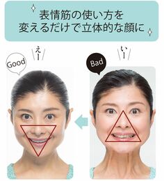 (右)口角を上げようとして横方向に力を入れると、エラが広がって顔が大きく見える (左)頬の筋肉で口角を引き上げ、両頬とあごで逆三角形をつくると理想の笑顔に!