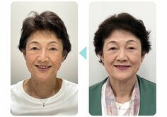 トレーニングを始めて1年半の70代の女性。顔全体が引き締まって頬が上がり、あごも細くなって目も開くように。グッと若々しい印象