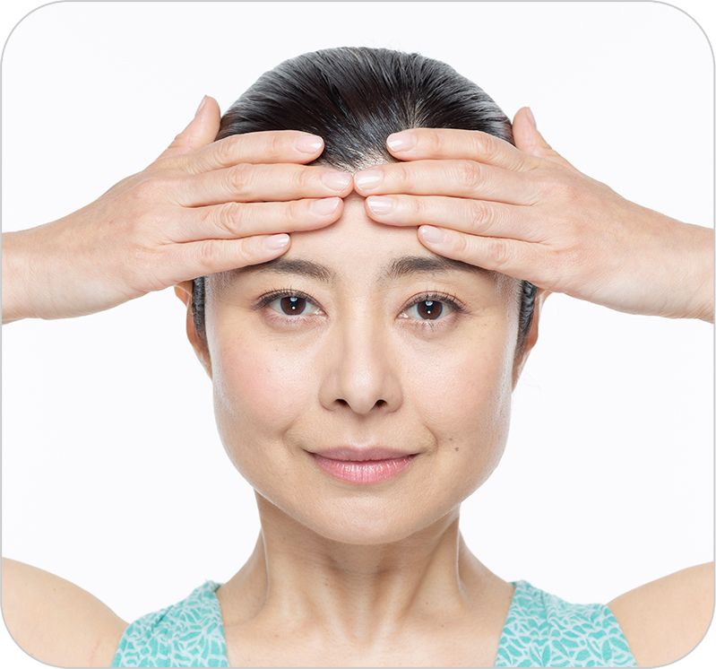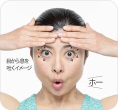 額を押さえたまま「ホー」と息を吐きながら大きく目を見開いて、3 秒キープ。2セット行う