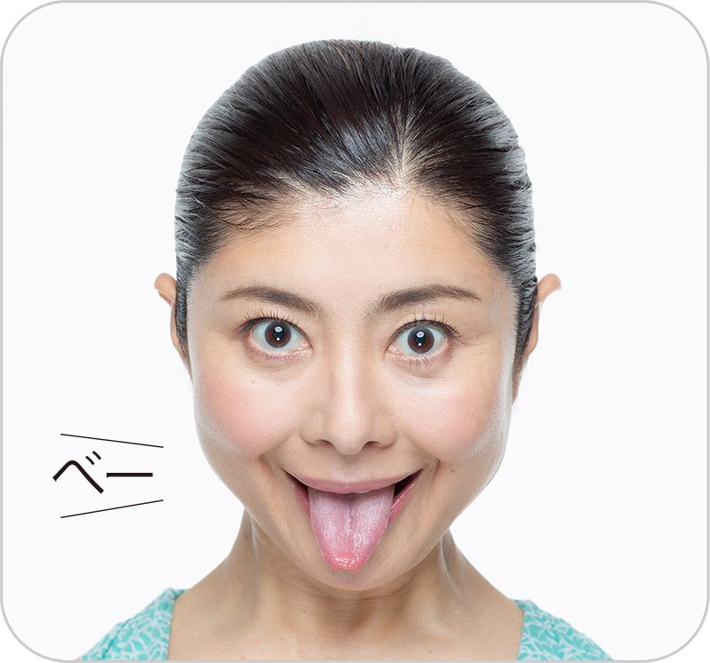 首の後ろを伸ばし、「ベー」と言いながら、舌を思いきり突き出す