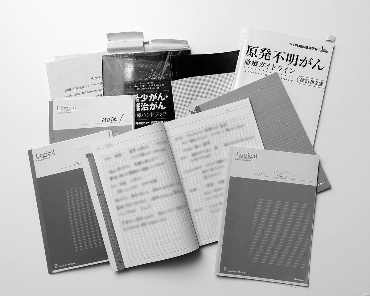 夫・保雄さんが原発不明がんと判明してから収集した資料と、闘病生活を記したノート(撮影:本社・武田裕介)