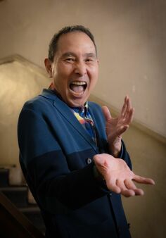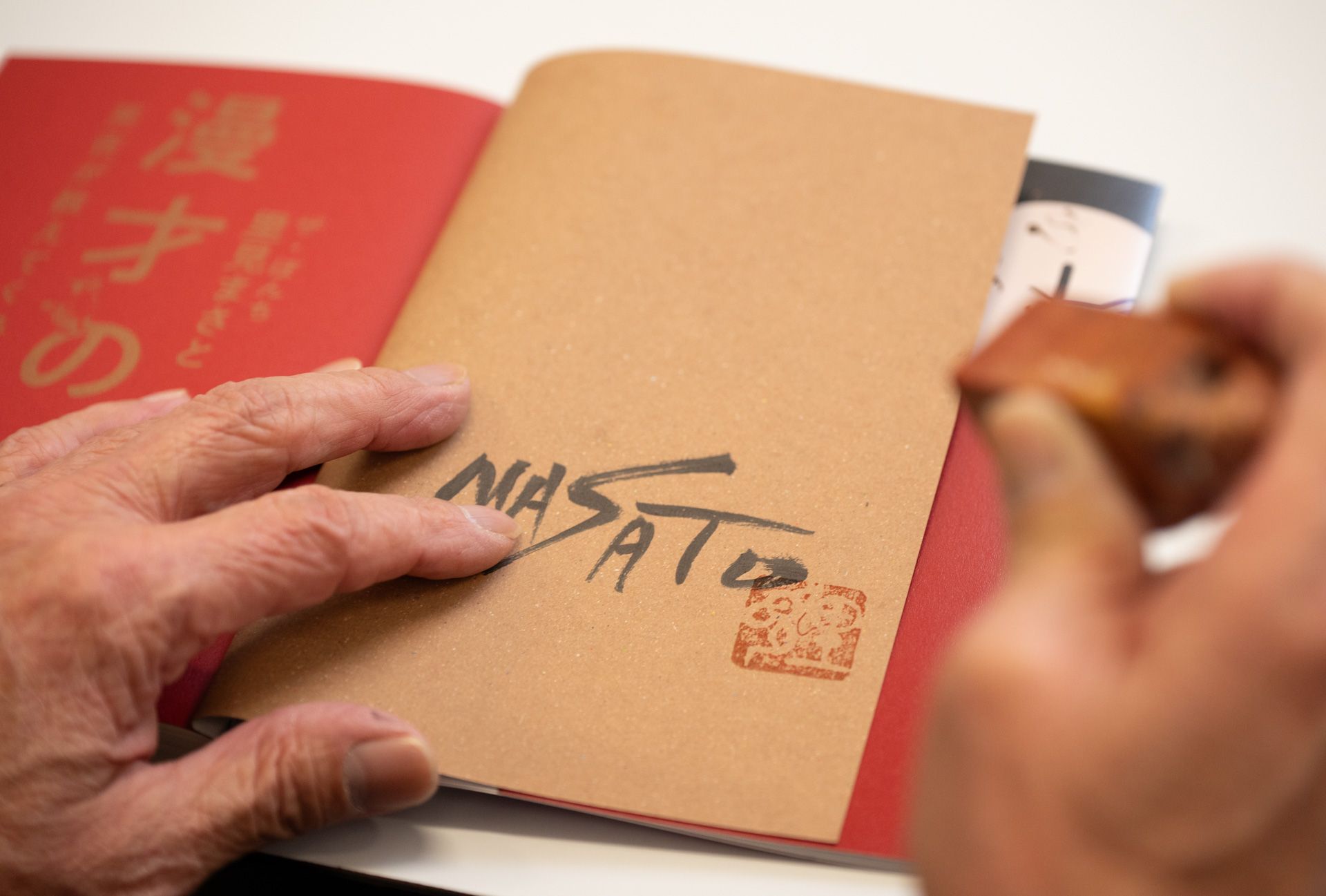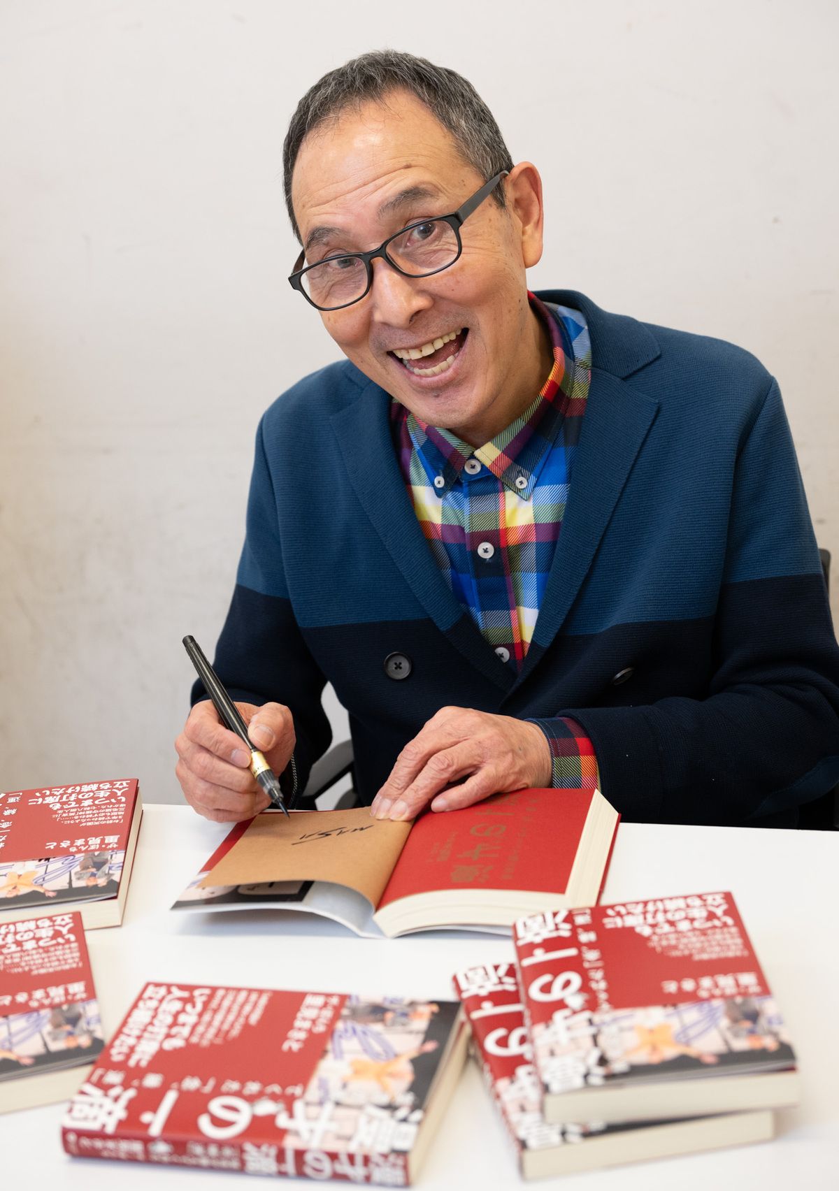 新刊『漫才の一滴 笑吉が教えてくれた「念、縁、運」』にサインを書く里見まさとさん