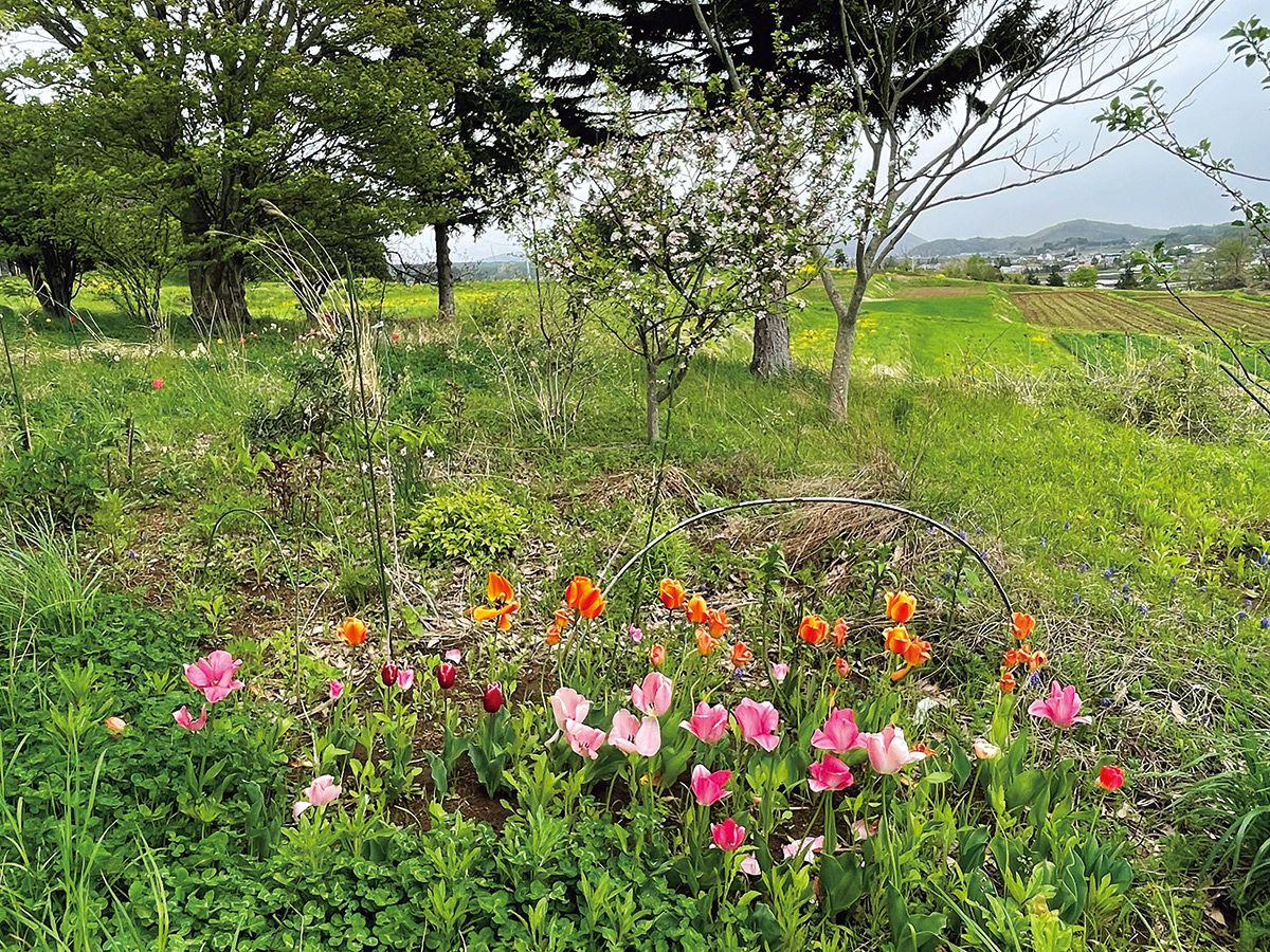 チューリップはこの辺にもっともっと咲き誇る。後ろはリンゴの木。(写真提供:『今だからわかること 84歳になって』/KADOKAWA)