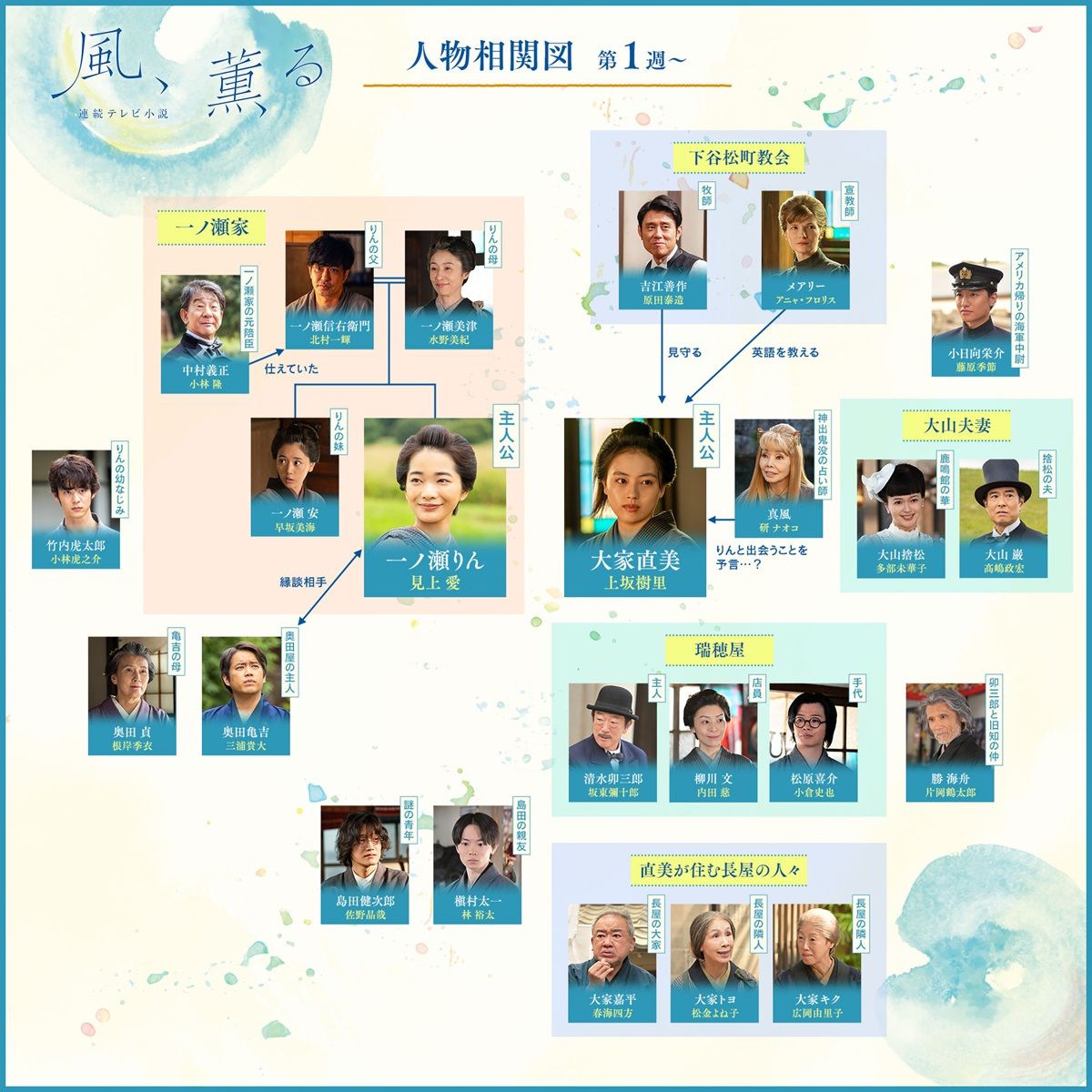次期朝ドラ『風、薫る』人物相関図が公開。見上愛、上坂樹里、多部未華子ら24人